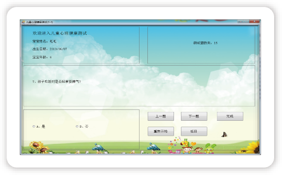兒童發育行為心理測試儀是一款致力于兒童發育行為篩查評估類的設備,該設備依據兒童心理發展需求設計卡通化界面,根據兒童發育規律,通過權威量表軟件化、工具測評標準化、輔助測試多樣化、操作過程簡易化,實現對兒童心理行為、智力發展、神經功能、運動能力等進行綜合評價。系統包括丹佛智力篩查測試、兒心評估量表、Gesell 、貝利嬰幼兒發育量表、0-1歲神經運動檢查20項等測評項目。提高臨床篩查服務效率,提升科室信息化水平。